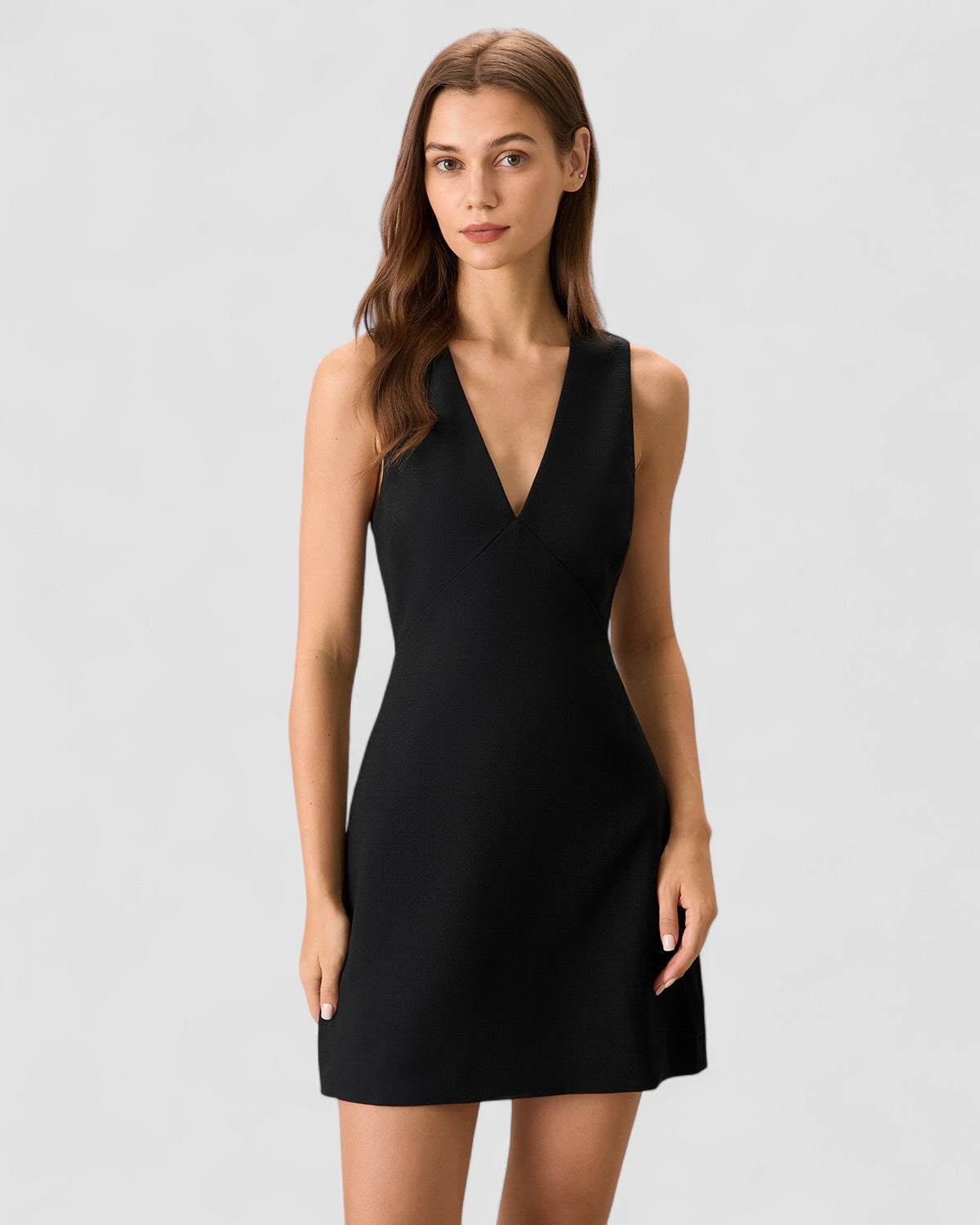 Kort klänning i lin och viskos - en perfekt kombination av stil och komfort! Denna mini klänning har en elegant V-ringning och är utan ärmar, vilket gör den idealisk för varma dagar. Med en hög midja och en A-linjeformad kjol framhäver den din figur på ett smickrande sätt.